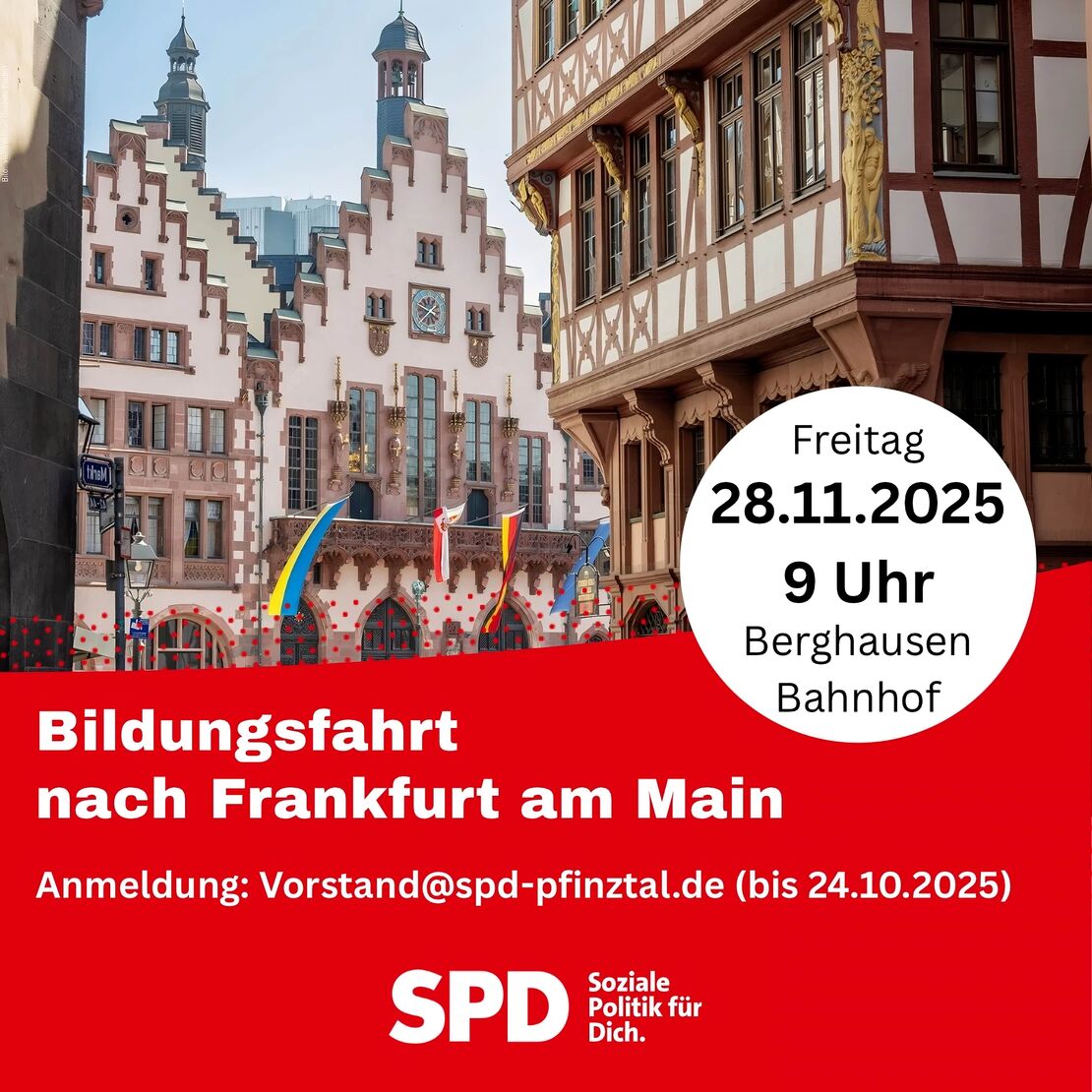 Der Vorsitzende der SPD Pfinztal, Malik Kartal, lädt alle interessierten Bürgerinnen und Bürger zur Teilnahme an einer Bildungsfahrt nach Frankfurt am Main am Freitag, den 28.11.2025 ab 9 Uhr ein.